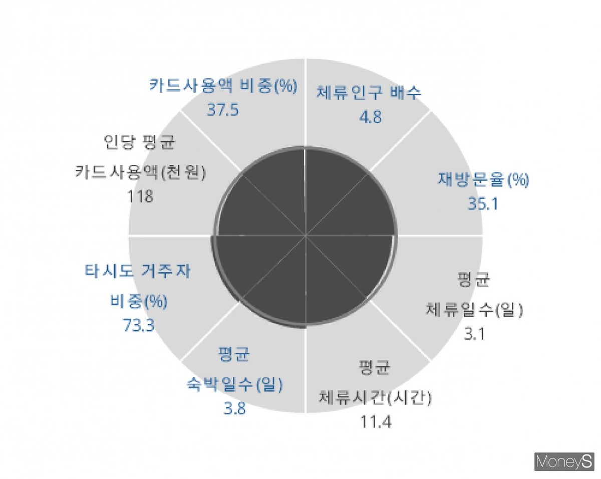 전남지역 인구소멸지역에서 사용하는 카드사용액 비중은 37.5%였으며 1인당 평균 카드사용액은 11만8000원으로 집계됐다. 또한 평균 숙박일수는 3.8일, 평균 체류시간은 11시간40분, 평균 체류일수는 3.1일, 재방문율은 35.1%로 나타났다.