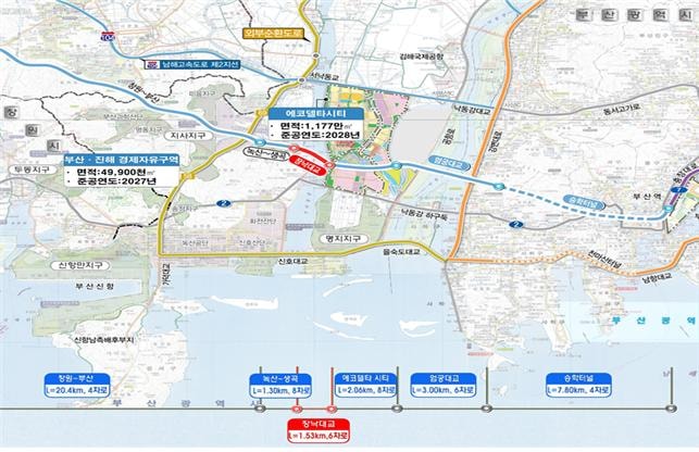 장낙대교 건설사업(부산진해경제자유구역청 북측진입도로 건설)은 총사업비 1748억원을 투입해 부산 강서구 생곡동과 에코델타시티를 연결하는 1.53km, 6차로의 대교를 건설하는 것으로 10일 현장 사무소 설치 등을 시작으로 착공에 들어간다. 준공과 개통은 2030년을 목표로 하고 있다.