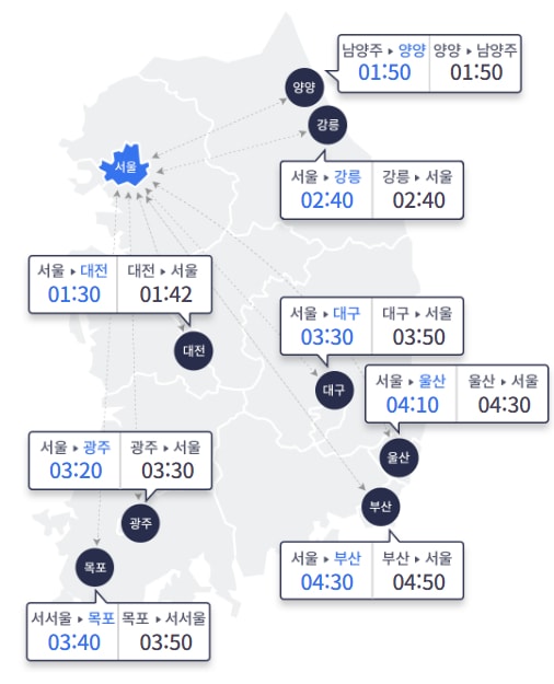 같은 시각 지방 도시에서 서울까지는 ▲부산 4시간50분 ▲울산 4시간30분 ▲강릉 2시간40분 ▲양양 1시간50분(남양주 도착) ▲대전 1시간42분 ▲광주 3시간30분 ▲목포 3시간50분(서서울 도착) ▲대구 3시간50분이다.