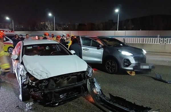 이 사고 충격으로 스포티지 차가 앞으로 밀려나면서 1∼2차로를 달리던 다른 차 2대와 잇따라 충돌했다. 모두 4대가 연쇄 사고를 냈다.