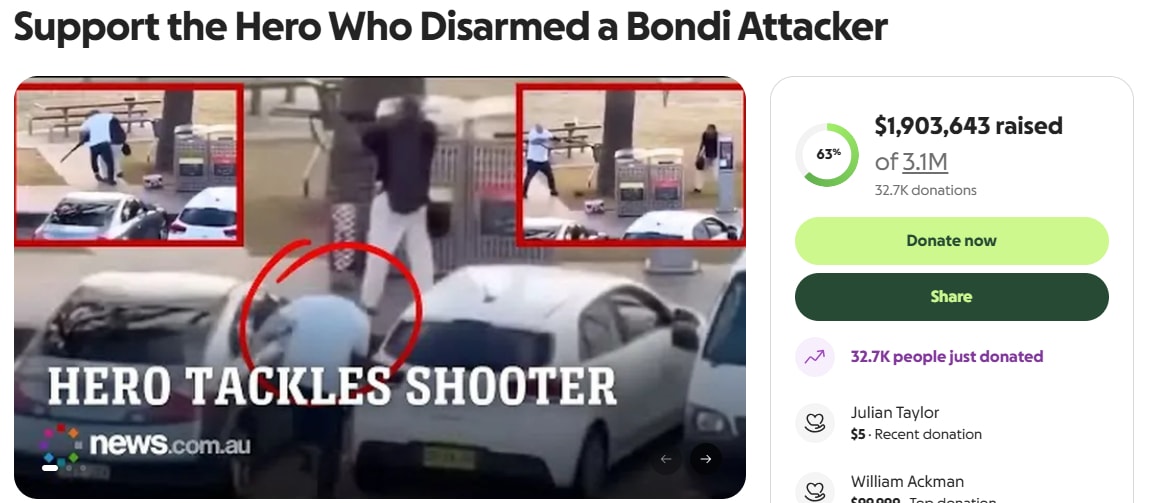 호주 본다이 해변 총격범을 제압한 시민 영웅을 위한 모금액이 18억원까지 모였다.