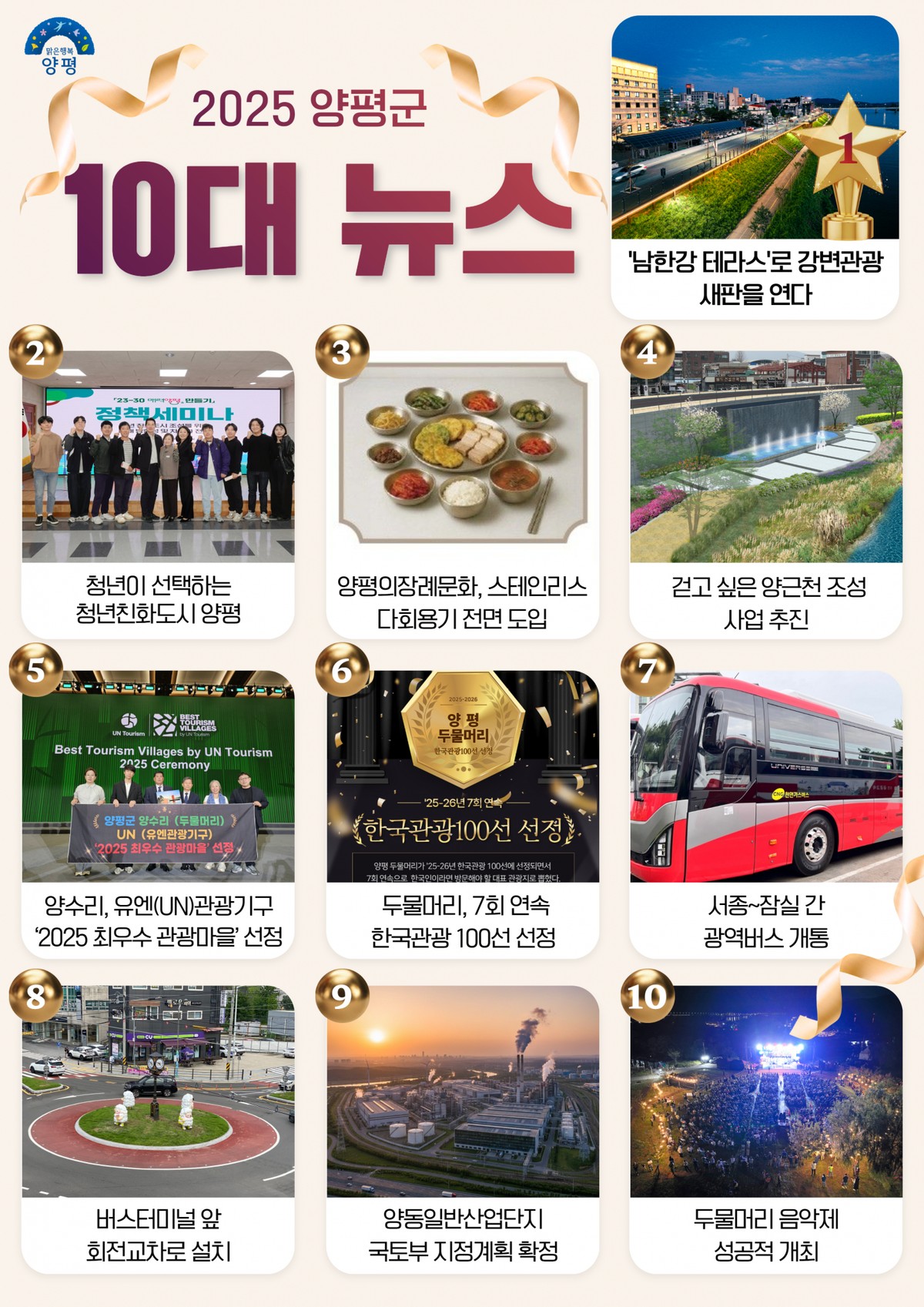 군민 4697명이 온라인 투표 방식으로 선정한 10대 뉴스에는 △1위 양평군, '남한강테라스'로 강변 관광 새판을 연다(1838표) △2위 양평군, 미래 일자리와 삶을 잇다… 청년이 선택하는 청년친화도시 양평(1521표) △3위 양평의 장례문화, 스테인리스 다회용기 전면 도입으로 쓰레기 96% 감축(1461표) △4위 양평군, '걷고 싶은 양근천 조성 사업' 추진(1434표) △5위 양평군 양수리, 유엔(UN) 관광기구 '2025 최우수 관광마을' 선정(1240표) △6위 양평군 두물머리, 7회 연속 한국관광 100선 선정(1169표) △7위 서종~잠실 간 광역버스 개통… 주민 숙원 해소(1127표) △8위 양평군, 버스터미널 앞 회전교차로 설치로 교통 불편 해소(1106표) △9위 "양평에 드디어 산업단지가"… 양동일반산업단지 국토부 지정계획 확정(1088표) △10위 두물머리 음악제 성공적 개최… '명품 문화도시' 도약 다짐(1079표)이 이름을 올렸다.
