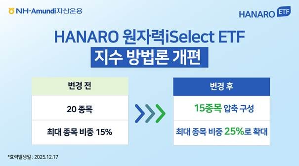 NH-아문디자산운용이 지수 방법론 개편에 따라 HANARO 원자력iSelect ETF의 리밸런싱을 진행한다.
