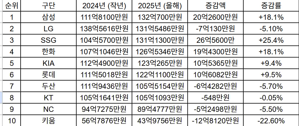 구단별 순위는 ▲1위 삼성 라이온즈 132억700만원 ▲2위 LG트윈스 131억5486만원 ▲SSG랜더스 131억1300만원 ▲한화 이글스 126억5346만원 ▲KIA타이거즈 123억265만원 ▲두산 베어스 105억5154만원 ▲KT위즈 105억1093만원 ▲NC다이노스 89억4777만원 ▲키움 히어로즈 43억9756만원 순이다. 10개 구단 모두 규정을 지켰다.