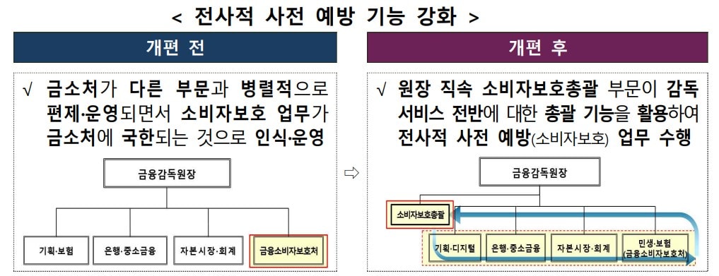 이에 따라 소비자보호 관련 규제와 금융상품 판매 감독 기능, 기존 감독총괄국을 통합해 ▲소비자보호감독총괄국 ▲소비자피해예방국 ▲감독혁신국으로 재편했다.