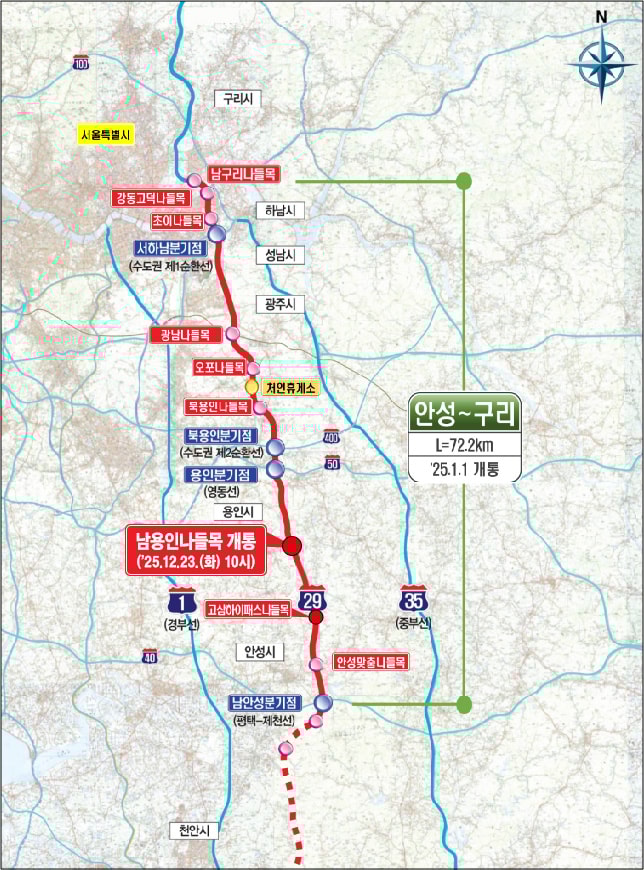 안성-용인-구리 구간(72.2㎞)은 1월 1일 개통됐다. 이 가운데 처인구 모현읍에서 원삼면까지 용인을 남북으로 관통하는 구간의 길이는 26㎞다. 포천-구리 구간(44.6㎞)은 지난 2017년 개통됐고, 안성-세종 구간(59.5㎞)은 2026년 말 개통 예정이다.