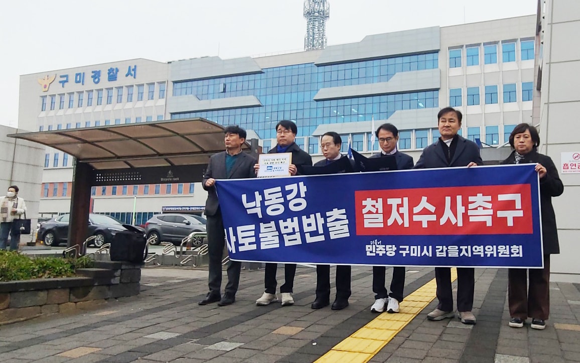 더불어민주당 구미지역위원회가 구미시의 낙동강 도시생태축 복원사업 과정에서 불거진 사토(골재) 매각 비리 의혹과 관련해 경찰에 고발장을 접수하며 엄정한 수사를 촉구했다.