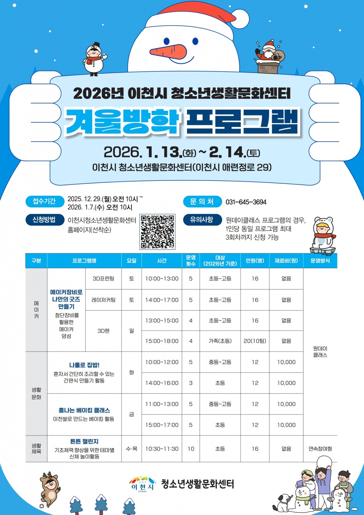 이천시 청소년생활문화센터가 2026년 정식 운영을 앞두고 관내 청소년들의 알찬 겨울방학을 지원하기 위해 오는 1월13일부터 2월14일까지 '2026년 겨울방학 프로그램'을 운영한다고 26일 밝혔다.