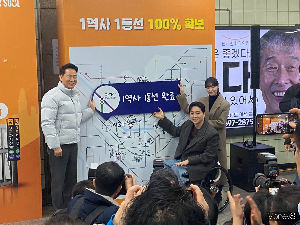 시는 29일 오후 서울 강서구 화곡동 지하철 5호선 까치산역에서 '전 역사 1역사 1동선 확보' 기념식을 개최했다. 2008년부터 올해까지 약 1751억원을 투입해 지하철 2·5호선 까치산역을 마지막으로 338개 역사에 엘리베이터 설치를 완료했다.