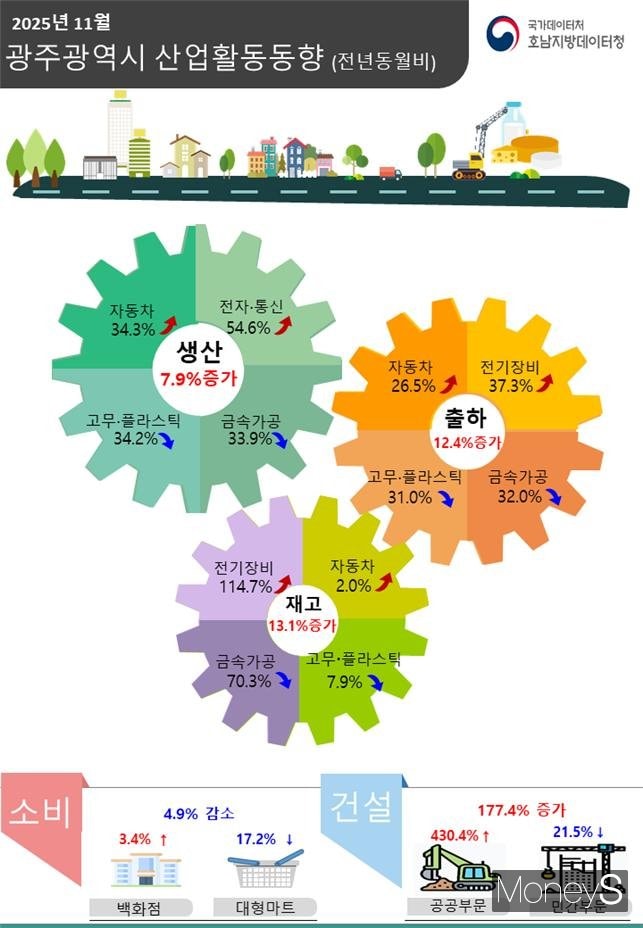 30일 호남지방데이터청이 발표한 '11월 광주·전남 산업활동동향'에 따르면 광주의 광공업 생산은 지난해 같은 달보다 7.9%가 늘었다.