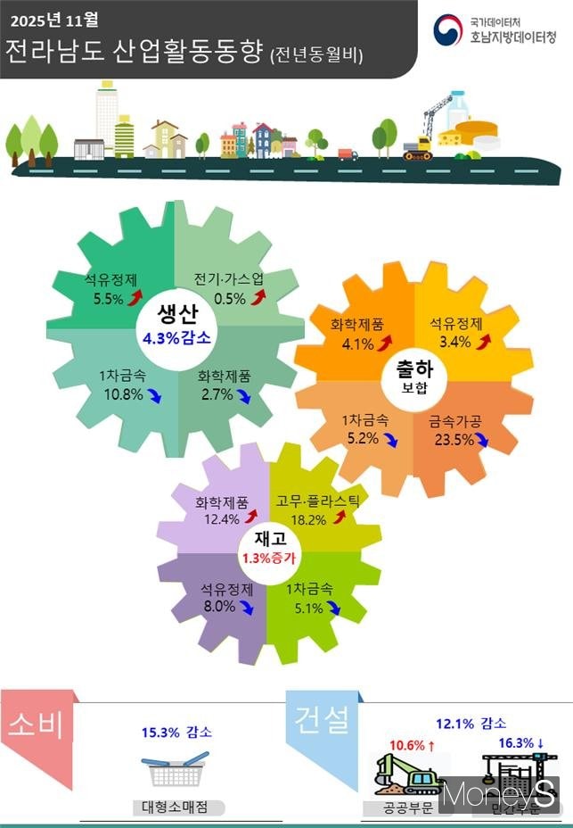 전남 광공업 생산은 지난해 같은 기간보다 4.3%가 감소했다.