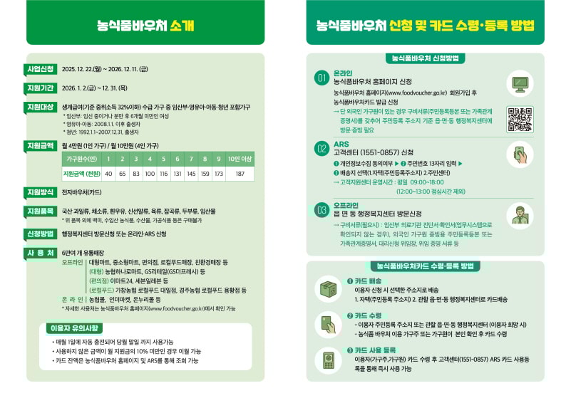 신청은 주소지 관할 읍·면·동 행정복지센터를 방문하거나 농식품 바우처 누리집을 통해 가능하다. 바우처를 이용 중인 가구는 자격 요건 유지 시 별도 신청 없이 자동으로 바우처가 지급된다.
