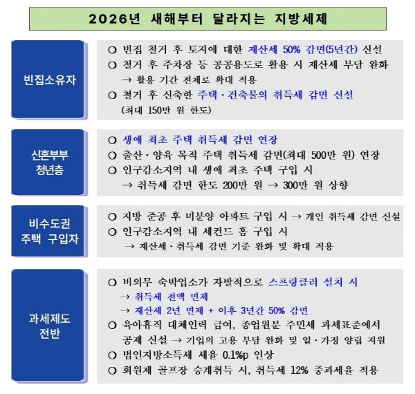 이번 개정은 크게 △빈집 정비 △출산·양육 주택 취득 지원 △지역 균형발전 △공정 과세체계 구축 등에 중점을 둔 것으로 보인다.