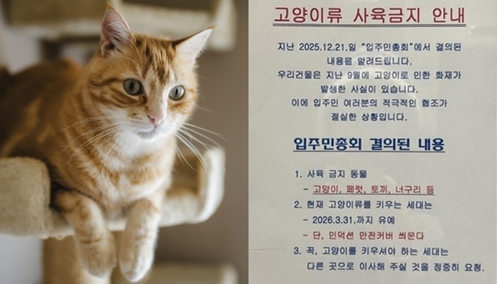 관리실은 공지문에서 "현재 고양이류를 키우는 세대는 인덕션 안전 커버를 반드시 설치해야 한다"며 "부득이하게 고양이를 계속 사육해야 하는 경우 다른 곳으로 이사해 줄 것을 정중히 요청한다"고 안내했다. 사육 유예 기간은 2026년 3월31일까지로 명시됐다.