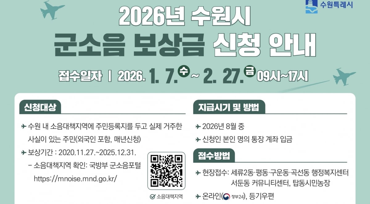 [수원 소식] '2026 군소음 피해보상금' 신청 접수