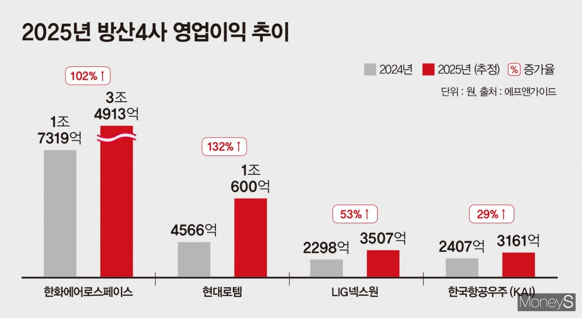 9일 금융정보기업 에프앤가이드에 따르면 방산 4사의 지난해 합산 영업이익은 5조2181억원으로 전망된다. 전년(2조6590억원) 대비 두 배 가까이 증가한 수치로 사상 첫 영업이익 5조원 시대를 열게 됐다. 합산 영업이익은 지난해 연초만 해도 3조원대를 기록할 것으로 예상됐으나 하반기 들어 4조원대로 상향됐다. 연말까지 막판 수주가 이어지면서 5조원 돌파가 유력해졌다.
