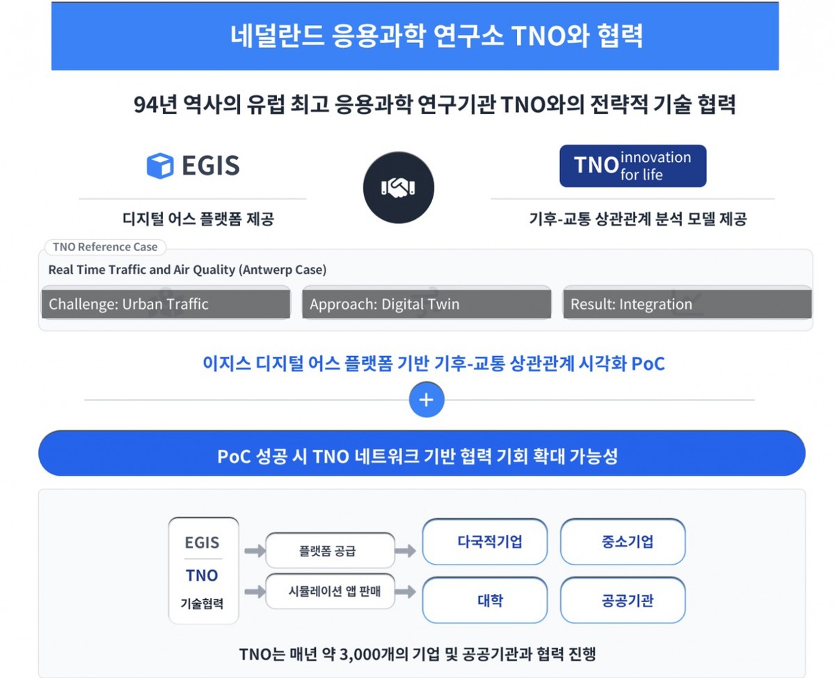 코스닥 상장사인 디지털 트윈 플랫폼 기업 이지스가 네덜란드 국책 연구기관인 TNO와 상호 기술 검증(PoC) 계약을 체결했다고 9일 밝혔다. 이번 계약은 강우에 따른 교통량을 3D로 구현하는 것이 가능한지 검증하는 것이 핵심이다.