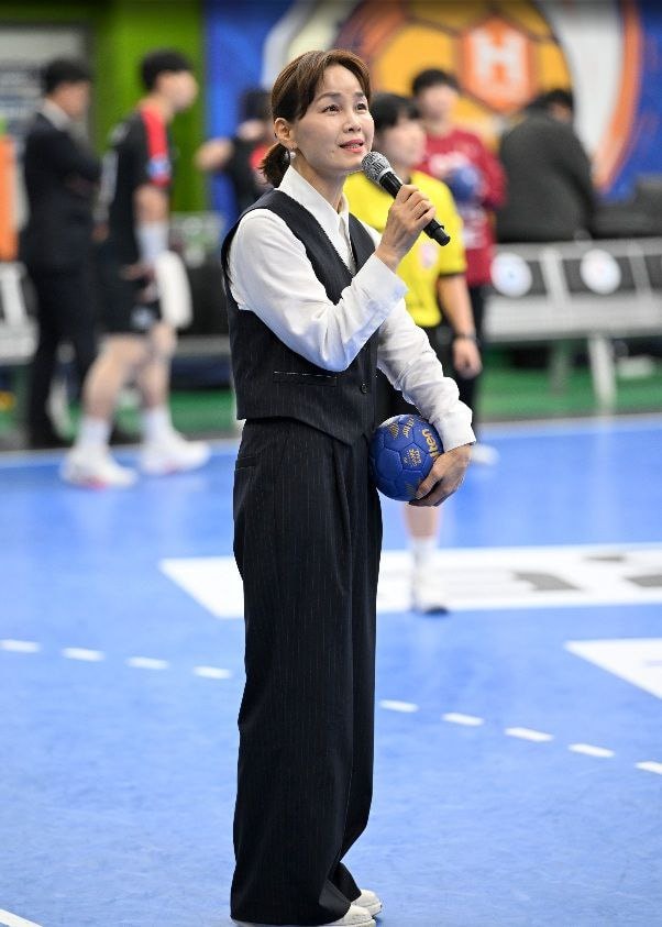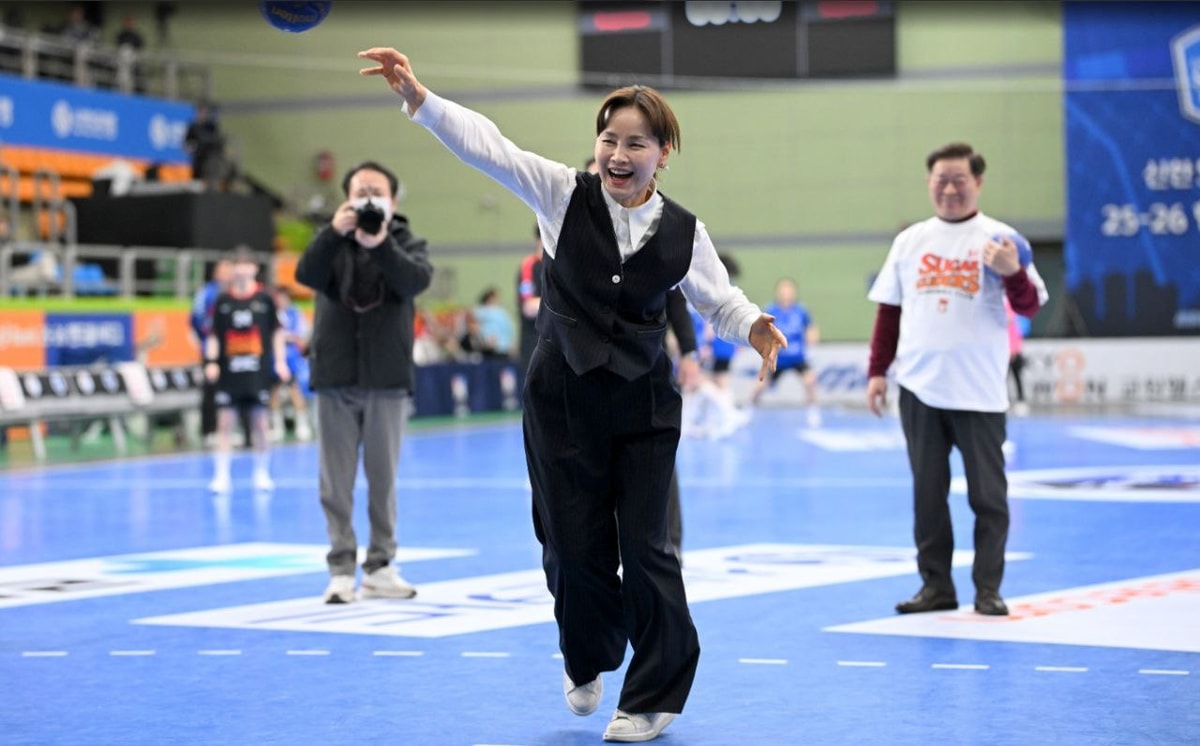 '우생순'(우리 생애 최고의 순간)의 주역 중 한 명인 임오경 의원(더불어민주당·경기 광명갑)이 10일 경기 광명시 광명시민체육관에서 열린 신한 SOL Bank 25-26 핸드볼 H리그 여자부 개막전에 시구자로 나섰다. /사진=한국핸드볼연맹 제공