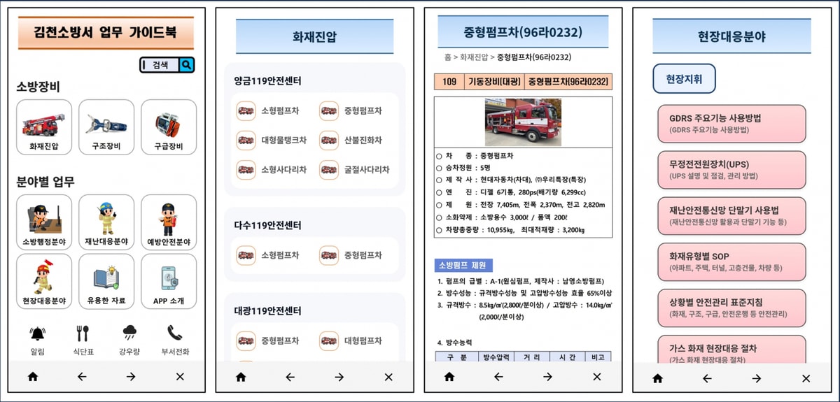 앱에는 △소방장비별 제원과 사용법 △점검·관리 시 유의사항 △현장 활동 참고사항 △업무 관련 주요 자료 등 실무 중심 콘텐츠가 수록돼 있다. 김천소방서는 향후 현장 의견을 반영해 자료를 지속적으로 보완·확대해 나갈 계획이다. 이를 통해 신규 직원의 업무 적응을 돕는 한편, 기존 직원들의 업무 효율성 향상에도 기여할 것으로 기대하고 있다.