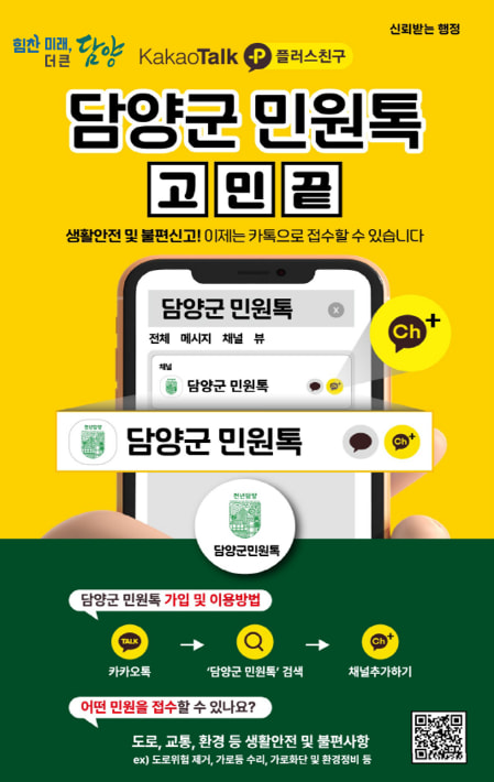 전남 담양군이 군민과의 소통을 확대하고 일상 속 불편사항과 안전 문제를 보다 신속하게 해결하기 위해 카카오톡 채널 '담양군 민원톡' 활성화에 나섰다.