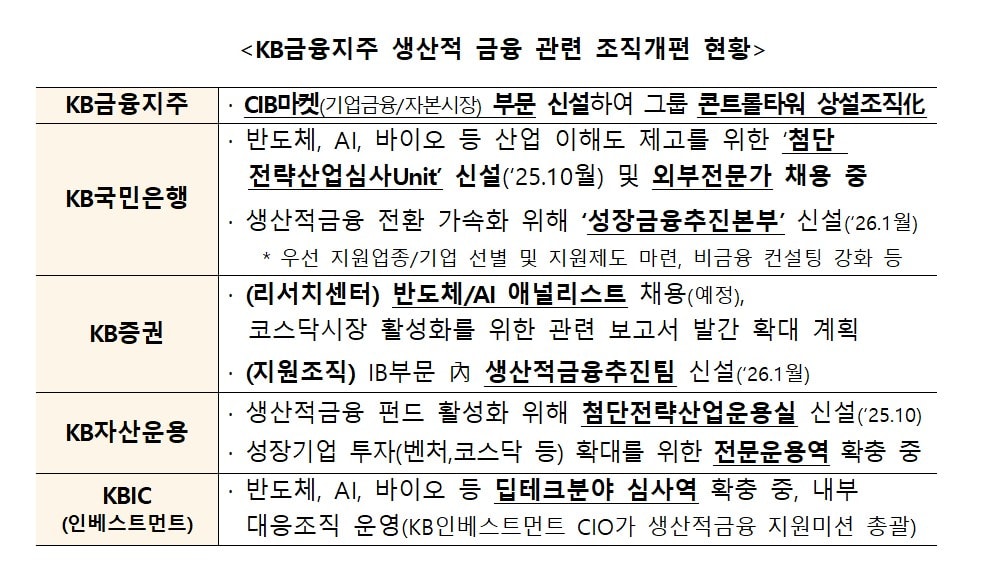 금융지주는 앞서 밝힌 계획을 보강해 총 584조원 규모의 지원책을 발표했다. KB금융지주는 지주·주요 계열사의 생산적금융 추진 조직을 신설·재편하고 영업점 평가제도(KPI, 생산적금융 별표지표 신설)와 영업지원체계를 개선했다.