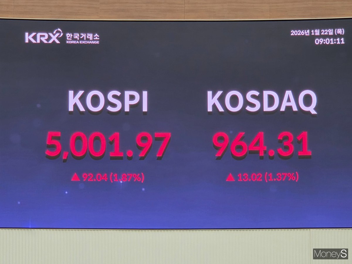 22일 한국거래소에 따르면 오전 9시10분 기준 코스피는 5015.06에 거래 중이다. 정확히 1년 전인 2025년 1월22일 2547.06에 불과했던 코스피는 단 1년 만에 96.30% 급등했다. 이 기간 차례대로 3000선과 4000선을 넘어 5000선까지 돌파했다.