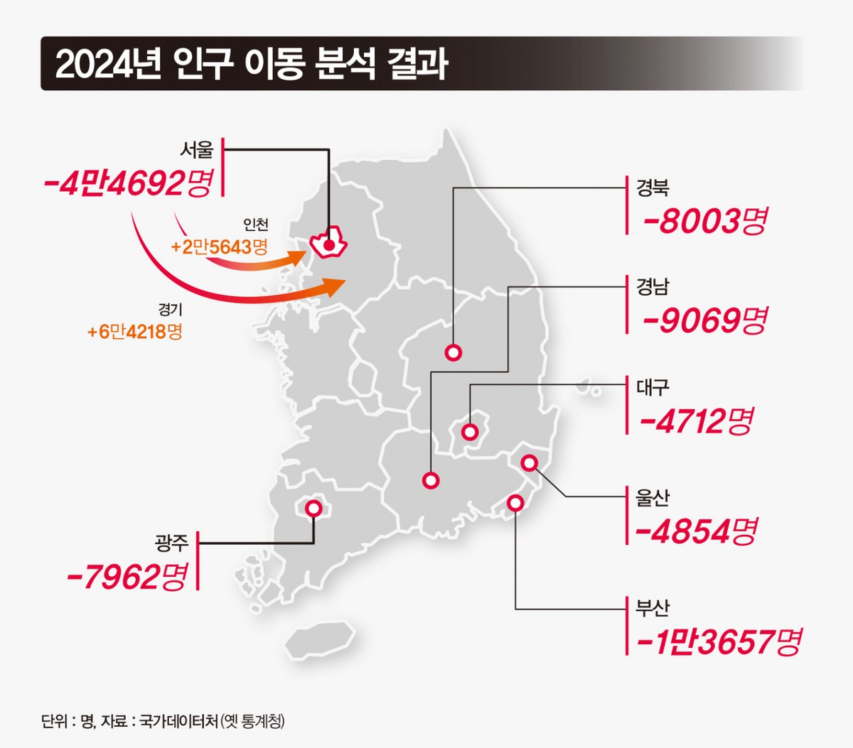 2024년 서울은 순이동 인구가 -4만4692명으로 감소했지만, 빠져나간 인구 상당수가 경기(6만4218명) 인천(2만5643명)으로 이동했다. 수도권 내 불균형은 다소 완화됐다고 평가할 수 있어도 지방으로 분산이 이뤄진 건 아니다.