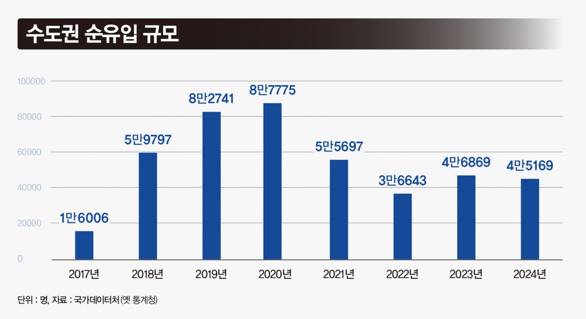 국가데이터처(옛 통계청)에 따르면 수도권 인구 순유입 규모는 ▲2017년 1만6006명 ▲2018년 5만9797명 ▲2019년 8만2741명 ▲2020년 8만7775명 ▲2021년 5만5697명 ▲2022년 3만6643명 ▲2023년 4만6869명 ▲2024년 4만5169명 등으로 정부의 국가균형발전 노력에도 지속해서 증가하는 흐름을 이어왔다.