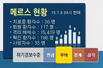 메르스 현황을 살펴보면 6일 오전 6시 현재, 치료 중인 환자는 36명(19.4%)으로 1명 줄었고, 퇴원자는 1명 늘어 총 117명(62.9%)으로 증가했다.