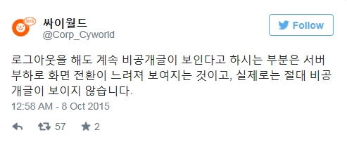 8일 싸이월드는 공식 트위터를 통해 "로그아웃을 해도 계속 비공개글이 보인다고 하는 부분은 서버 부하로 화면 전환이 느려져 보여지는 것"이라며 "실제로는 절대 비공개글이 보이지 않는다"고 말했다.