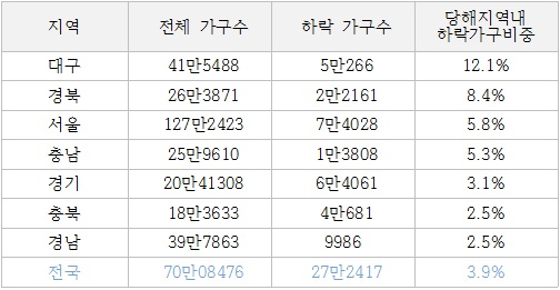 시도별로 보면 대구가 전체 41만5488가구의 12.1%(5만266가구)가 하락해 전국에서 비중이 가장 컸다. 다음으로는 경북이 8.4%(2만2161가구) 내렸다. 수도권은 서울이 127만2423가구 중 5.8%(7만4028가구) 하락했고 경기는 3.1%(6만4,061가구)가 하락했다.