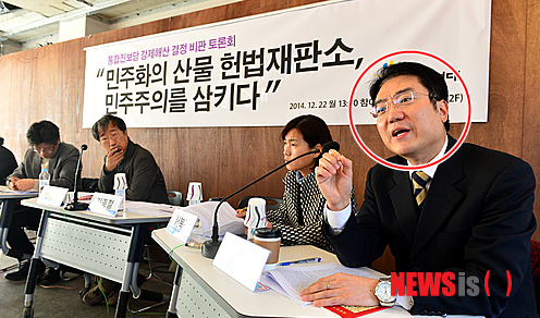 '임지봉 교수' 임지봉 서강대 법학전문대학원 교수(맨 오른쪽)가 2014년 12월 참여연대에서 열린 ‘헌법재판소 통합진보당 해산 결정 비판 토론회’에서 발언을 하고 있다. /자료사진=뉴시스