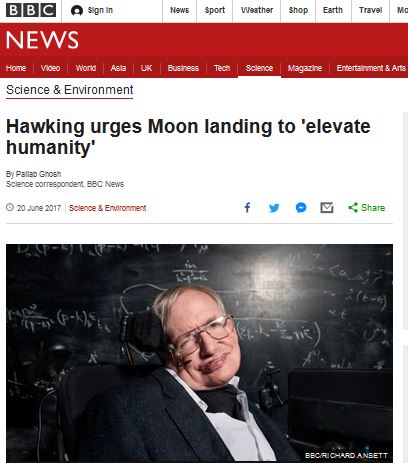 스티븐 호킹 박사가 "2020년까지 달에 우주인을 보낼 선도국가가 나와야 된다"고 말했다. 또 "30년 안에 달에 기지를 만들고 2025년까지 화성에 사람을 보내는 것을 목표로 해야 한다"는 주장도 내놨다.