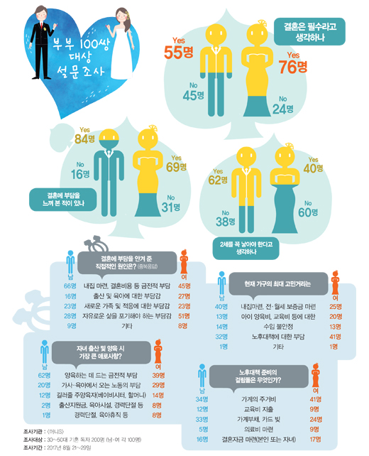 결혼은 얻는 것보다 잃는 게 더 많은 것일까. 실제 부부들이 안고 사는 고민은 어떤 것일까. <머니S>가 창간 10주년 특별기획으로 30~50대 기혼독자 200명(남녀 각각 100명)을 대상으로 설문조사를 실시해 그들이 가진 결혼에 대한 인식과 현실적인 문제가 무엇인지 들여다봤다.
