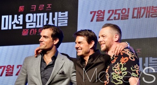 할리우드 액션 블록버스터 미션임파서블의 6번째 작품인 '미션임파서블: 폴아웃(감독 크리스토퍼 맥쿼리)' 내한 기자회견이 16일 서울 잠실 롯데월드호텔에서 열린 가운데 배우 헨리 카빌(왼쪽부터), 톰 크루즈, 사이먼 페그가 포토타임을 갖고 있다. /사진=임한별 기자