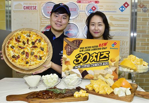 도미노피자가 새롭게 선보이는 ‘30치즈&뉴욕 스트립 스테이크 피자’는 모차렐라, 체더, 프로볼로네, 페터, 크리미 고르곤졸라 등 무려 30가지의 치즈를 아낌없이 올려 고소함과 부드러움으로 도우를 가득 채웠다.