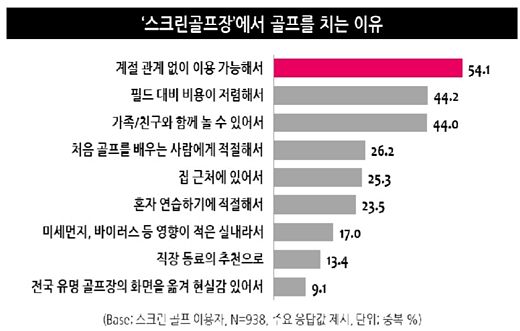 스크린골프장을 찾는 이유는 “계절에 관계 없이 이용가능하고, 필드에 나가는 것보다 비용이 저렴해서”