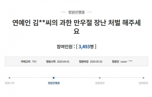 이와 더불어 이날 청와대 국민청원 게시판에는 ‘연예인 김** 씨의 과한 만우절 장난 처벌해주세요’라는 글이 게재됐다.