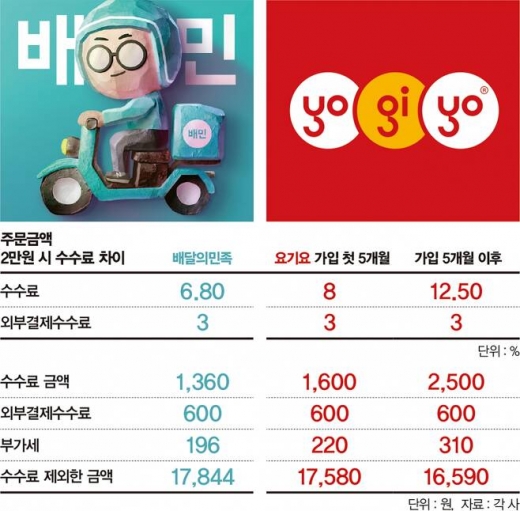 한달 매출이 2000만원이라고 가정할 때 배민에 지급해야 할 월 수수료는 200만원이 넘고 요기요에 내야할 수수료는 350만원에 육박하는 셈이다. 업주들은 “배민 수수료도 부담이지만 뭐니뭐니해도 이 구역 수수료 왕은 요기요”라고 입을 모은다.