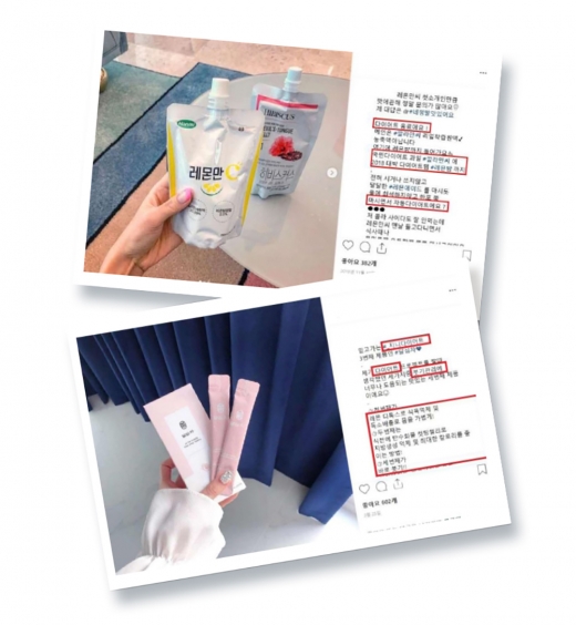 정작 상품엔 하자가 있는 경우가 대다수다. 실제로 10만명 이상의 팔로워를 거느린 인플루언서가 소개한 새싹보리 분말 상품에서 기준치를 초과한 대장균과 금속성 이물질이 나온 사례도 있었다. 식약처 조사 결과 이 제품에서는 신선하게 보이기 위해 섞어 넣은 청색과 황색의 타르 색소도 검출됐다.