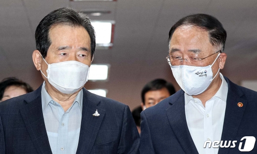 정세균(왼쪽) 국무총리와 홍남기 경제부총리 겸 기획재정부 장관이 1일 서울 종로구 정부서울청사에서 열린 국무회의에 참석하고 있다./사진=뉴스1