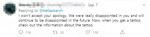 한 한국 누리꾼이 7일 벨라 포치의 사과에 답글로 “사과를 받지 않겠다”고 전했다. /사진=트위터 캡처