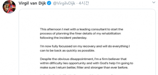 반 다이크는 이날 자신의 트위터를 통해 "부상 회복에 모든 초점을 맞추고 있다. 가능한 한 빨리 돌아오기 위해 모든 걸 쏟을 것"이라며 "응원의 메시지를 보내주신 모든 분들께 감사드린다"고 밝혔다.