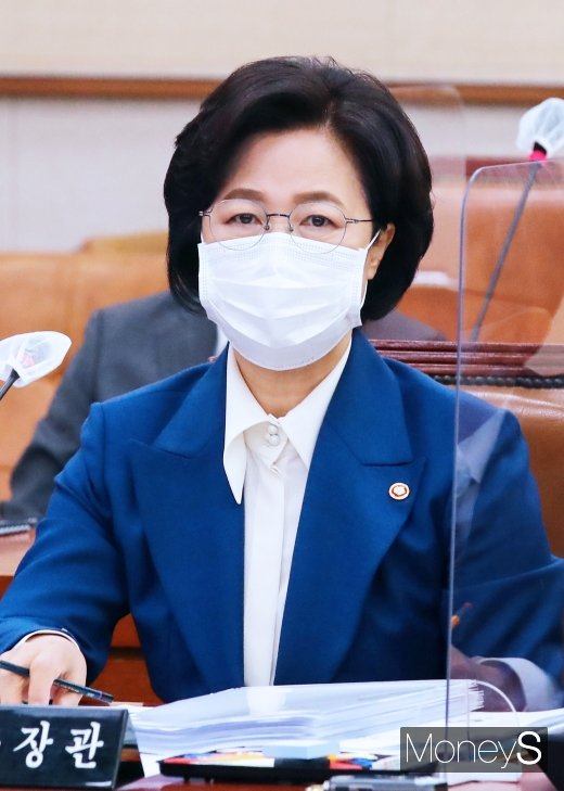 추미애 법무부 장관이 26일 서울 여의도 국회 법제사법위원회에서 열린 법무부 종합국정감사에서 의원들의 질의에 답하고 있다. /사진=임한별 기자