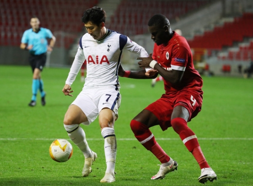 토트넘 홋스퍼 공격수 손흥민(28·왼쪽)이 30일(한국시간) 벨기에 안트베르펜의 보사윌 스타디온에서 열린 2020-21 유럽축구연맹(UEFA) 유로파리그 로열 앤트워프 FC와의 조별예선 경기에서 공을 몰고 있다. /사진=로이터