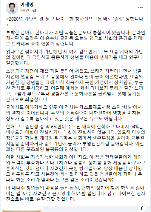 이날 이 지사는 네이트 판 게시판에 올라온 ‘요즘 흙수저 집안에서 애 낳으면 생기는 일’이라는 게시물을 공유하며 투박한 한마디가 어떤 학술논문보다 통찰력이 있다고 이같이 말했다.