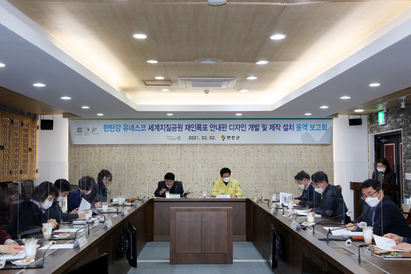 연천군은 한탄강 유네스코 세계지질공원의 지속가능한 관광 활성화를 위해 지난 2일 군청 상황실에서 ‘한탄강 유네스코 세계지질공원 관광안내체계 개선을 위한 안내판 디자인 개발 및 제작 설치’ 용역 보고회를 실시했다고 3일 밝혔다. 용역보고회는 김광철 연천군수와 최숭태 연천군의회의장을 비롯하여 의원 및 관련 과장 등이 참석한 가운데 본 과업을 맡은 주식회사 비큐 신동윤 대표로부터 착수 보고를 받았다.