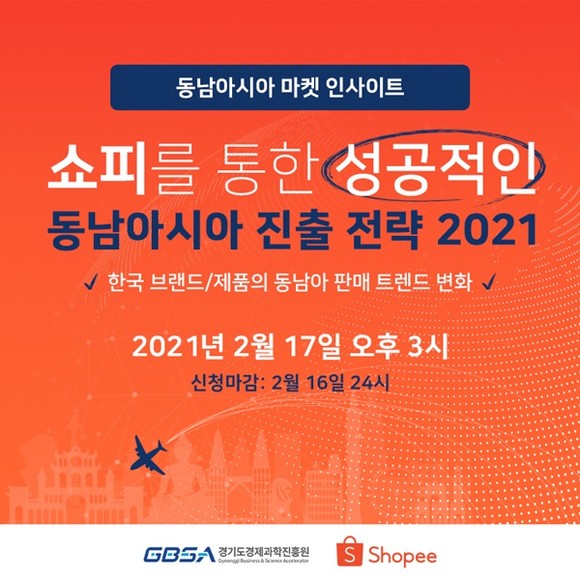 경기도경제과학진흥원(이하 경과원)이 해외 온라인 마켓 입점을 원하는 중소기업을 위해 ‘쇼피코리아를 통한 성공적인 동남아시아 진출전략’을 주제로 오는 17일 오후 3시 쇼피(Shopee) 웹세미나를 라이브로 개최한다고 15일 밝혔다. / 자료제공=경기도경제과학진흥원