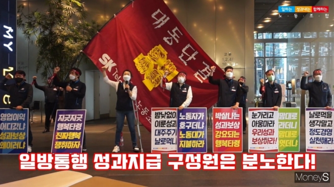 지난 2월5일 SKT 노조가 성과급 규모와 산정방식에 대해 문제를 제기하며 시위를 하는 모습. /사진=온라인 캡처