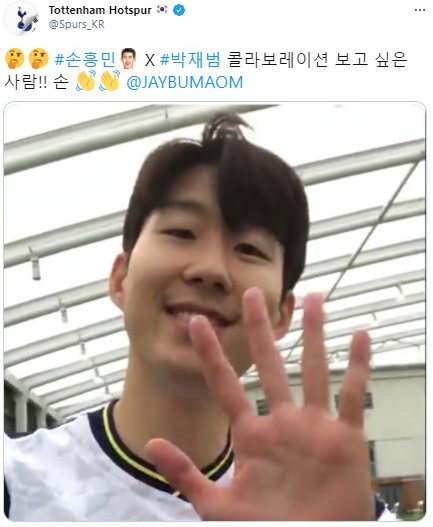 토트넘이 공식 트위터에 손흥민, 박재범 콜라보레이션 가능성을 암시했다.11일 토트넘 한국 공식 트위터는 손흥민 관련 트윗을 남겼다. 토트넘은 "손흥민 X 박재범 콜라보레이션 보고 싶은 사람 손"이라는 코멘트와 손흥민 사진을 올렸다. 팬들은 두 월드 스타의 조합을 보고 싶다며 긍정적인 댓글들을 남겼다.